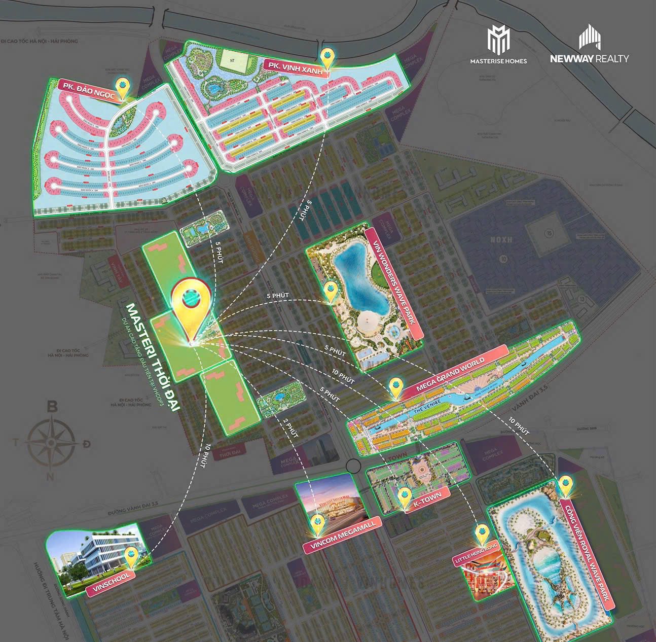 Từ dự án, cư dân chỉ mất 3-5 phút để di chuyển đến Vịnh Biển Bốn Mùa, Trung tâm giải trí Mega Grand World , Vincom, Vinshool, VinMec,...dễ dàng di chuyển tới vành đai 3 & Đại Lộ Hừng Đông (kết nối Quốc lộ 5A và 5B).
